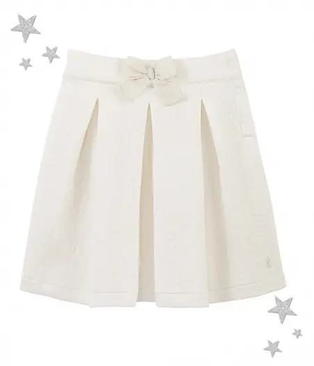 Дуже гарна жакардова спідниця для дівчинки, прикрашена чарівним бантиком на талії та глибокими збірками. Спідниця має застібку на кнопки збоку. Ця вишукана спідниця ідеально підійде для свята. Матеріал: 85% бавовна, 15% поліестер.