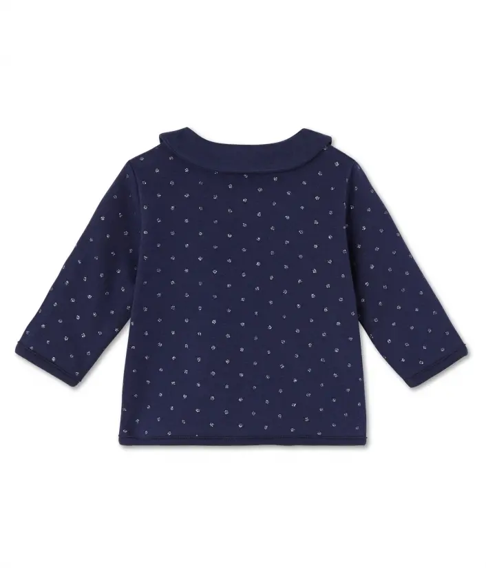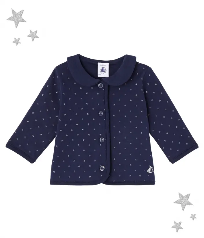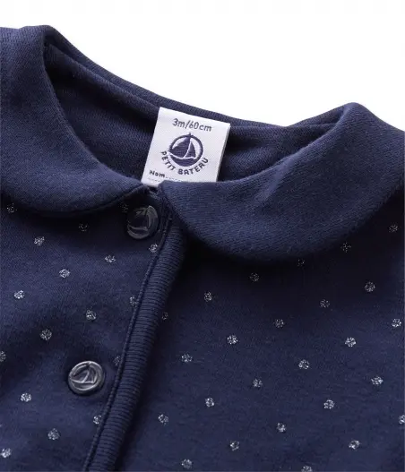 Кардиган в серебристый горошек для девочки, изготовленный из теплой и приятной на ощупь ткани. Обратите внимание на воротничок в стиле "Питер Пэн" и кнопки с изображением кораблика Petit Bateau. Этот кардиган идеально завершит образ для торжественных праздников. Материал: 100% хлопок.