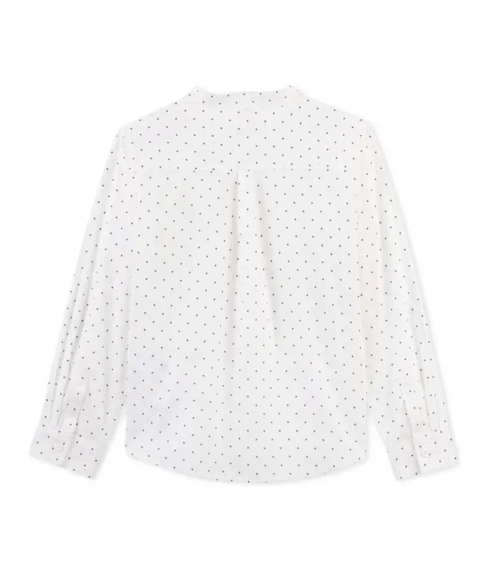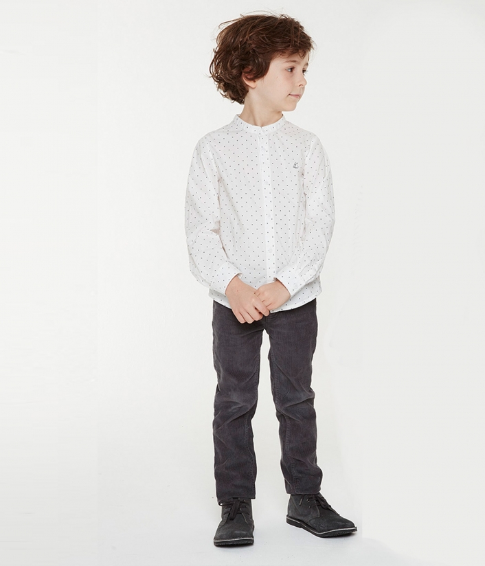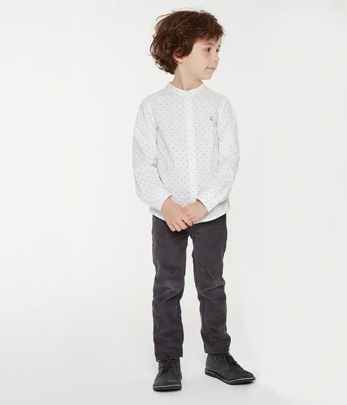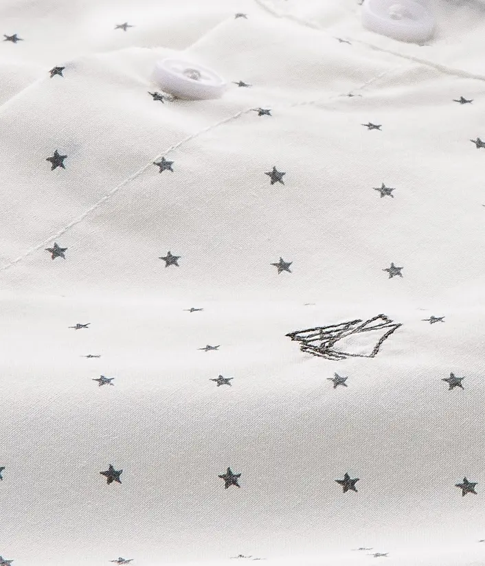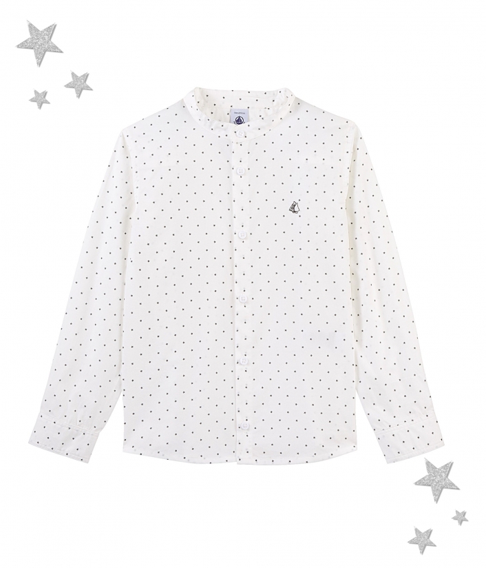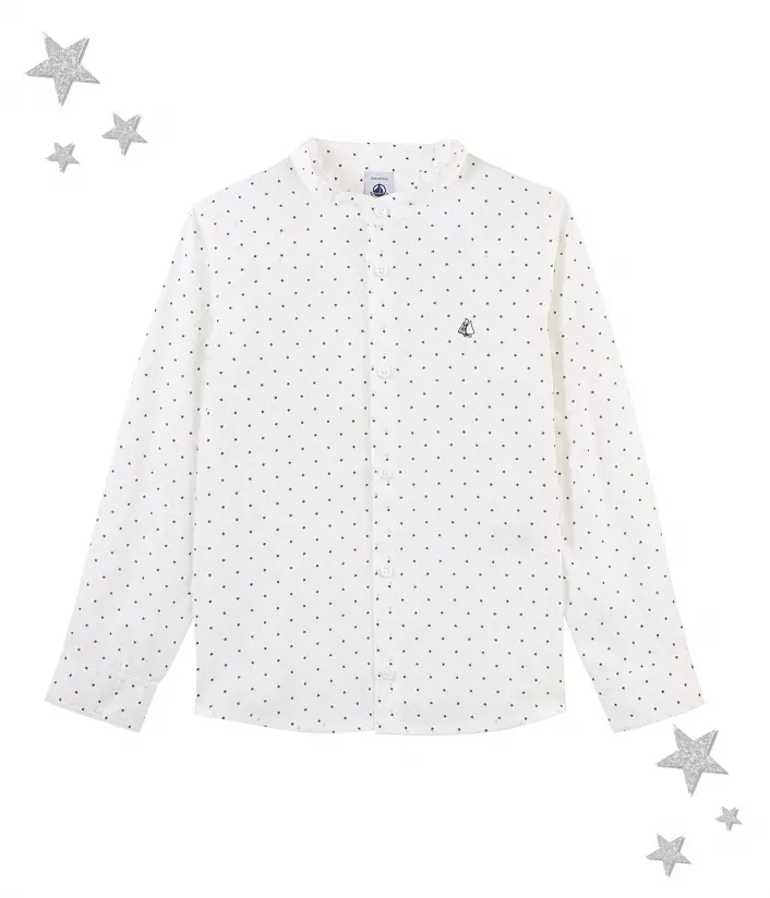 Рубашка с длинными рукавами для мальчика, изготовлена из поплина с принтом в мелкие звездочки. Рубашка декорирована перламутровыми пуговицами и складкой на спине. Материал: 100% хлопок.