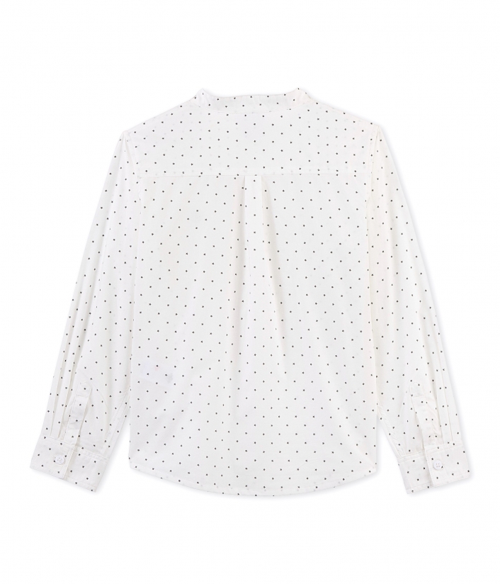Сорочка з довгими рукавами для хлопчика, вироблена з попліну з принтом у дрібні зірочки. Сорочка декорована перламутровими ґудзиками та складкою на спині. Матеріал: 100% бавовна.