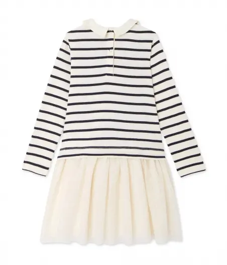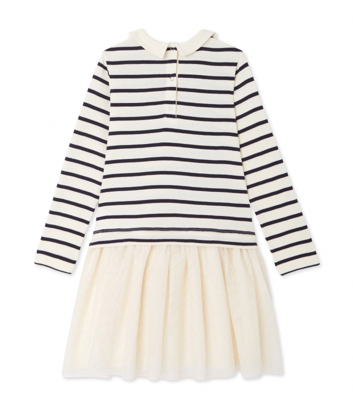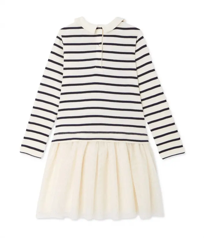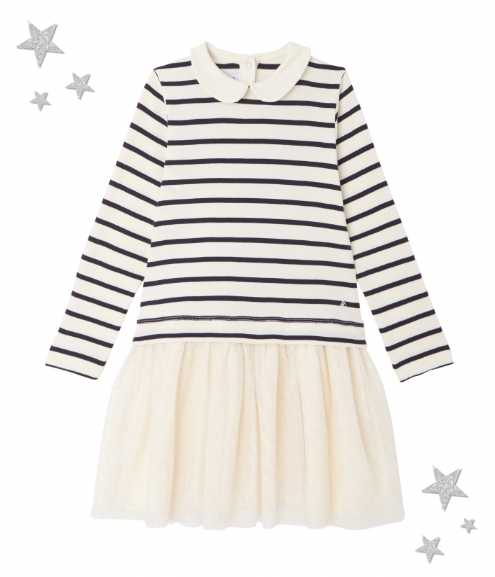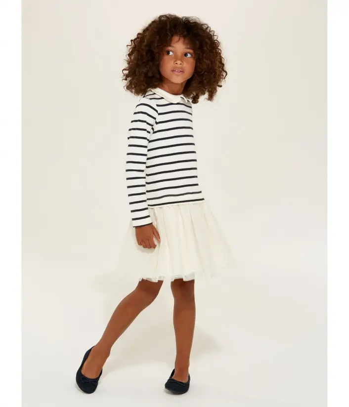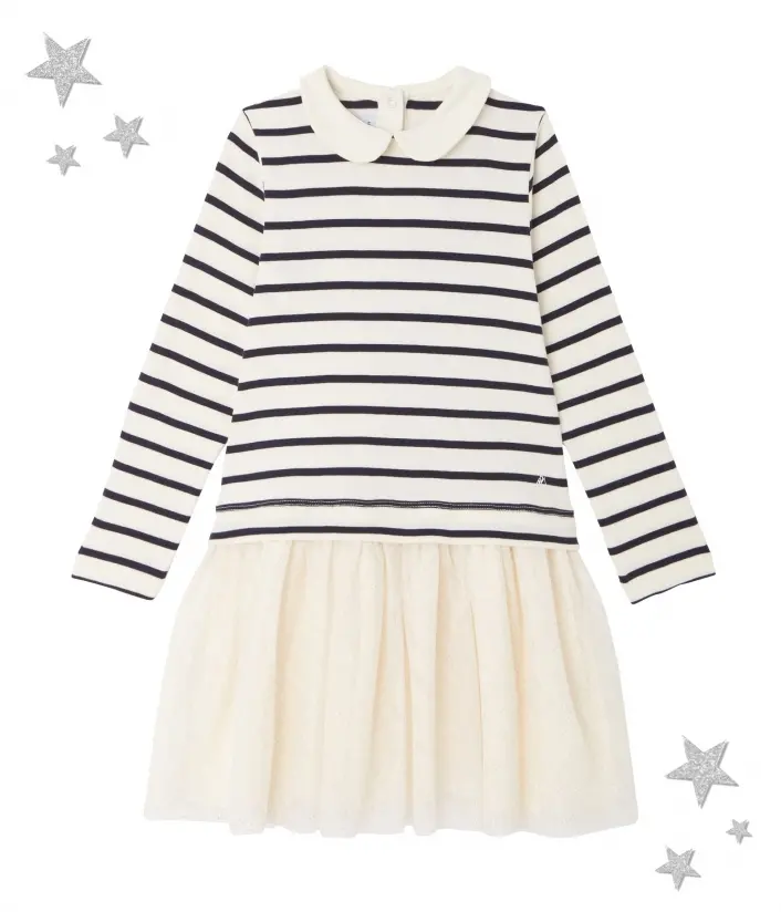 Гарна святкова сукня з довгими рукавами, оздоблена спідничкою з фатину, прикрашеного блискітками. Верх сукні виготовлений з трикотажу у смужку. Сукня оздоблена застібкою на кнопки на спині, та комірцем у стилі "Пітер Пен". Чудовий вибір для вечірки! Матер