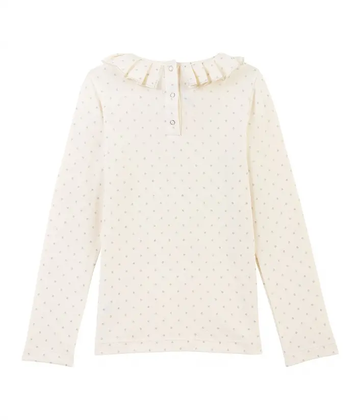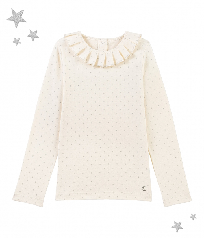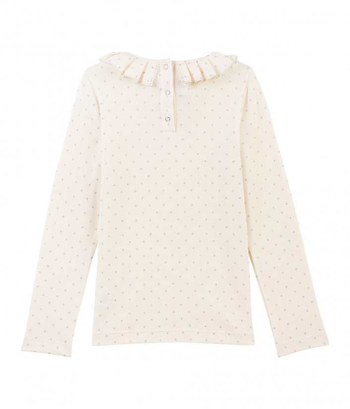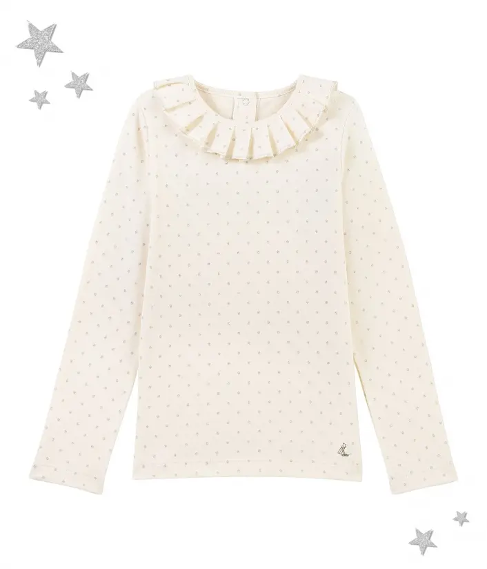 Футболка в серебристый горошек для девочки. Имеет очень изысканный и женственный вид, благодаря гофрированному воротнику. Застежка на спинке футболки упростит одевание. Материал: 100% хлопок.