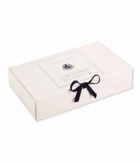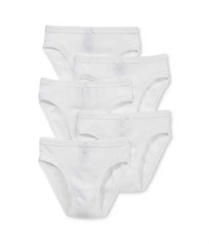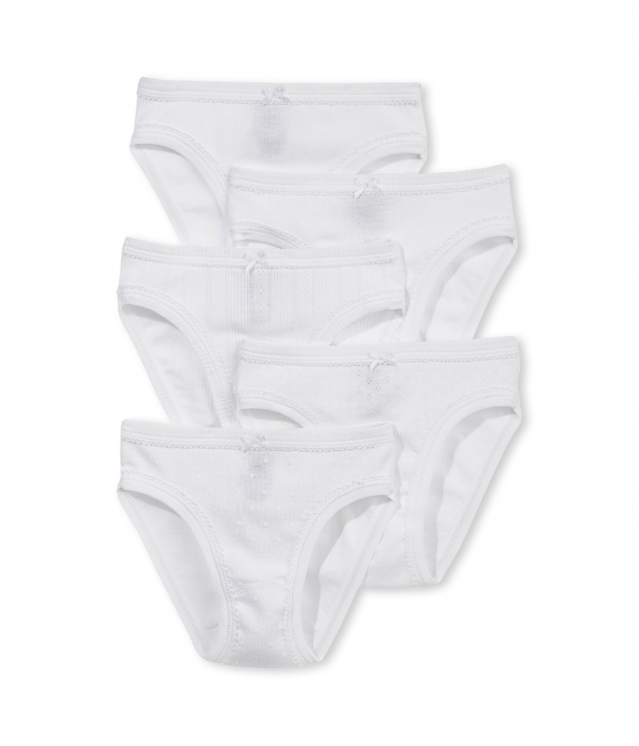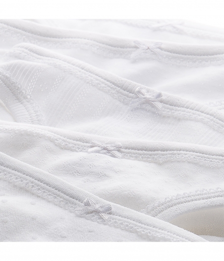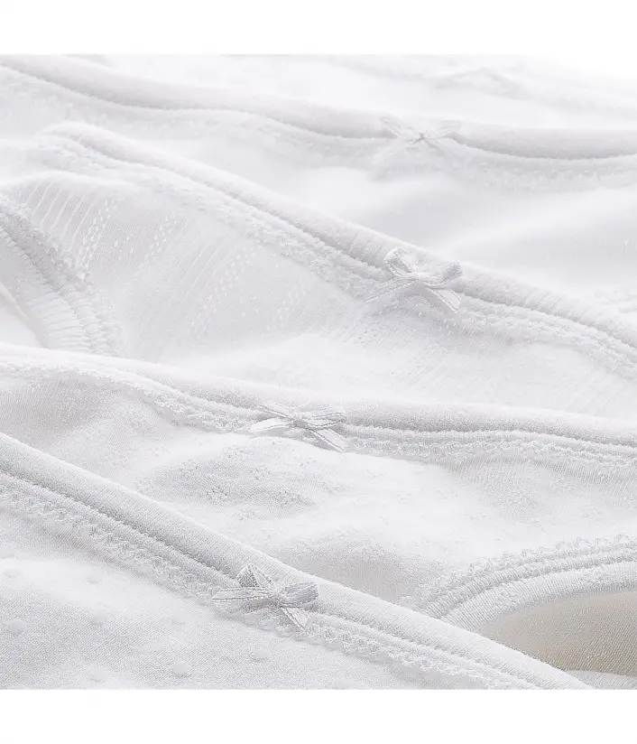 Набір з п'яти білих трусиків для дівчини, виготовлених з бавовняної тканини з різним візерунком. Кожні трусики прикрашені елегантним бантиком. Матеріал: 100% бавовна.