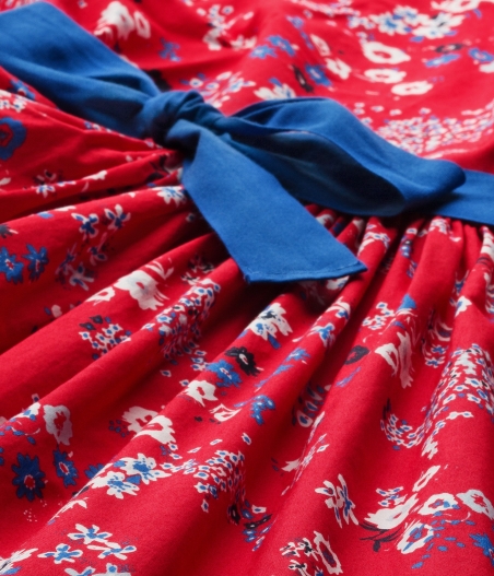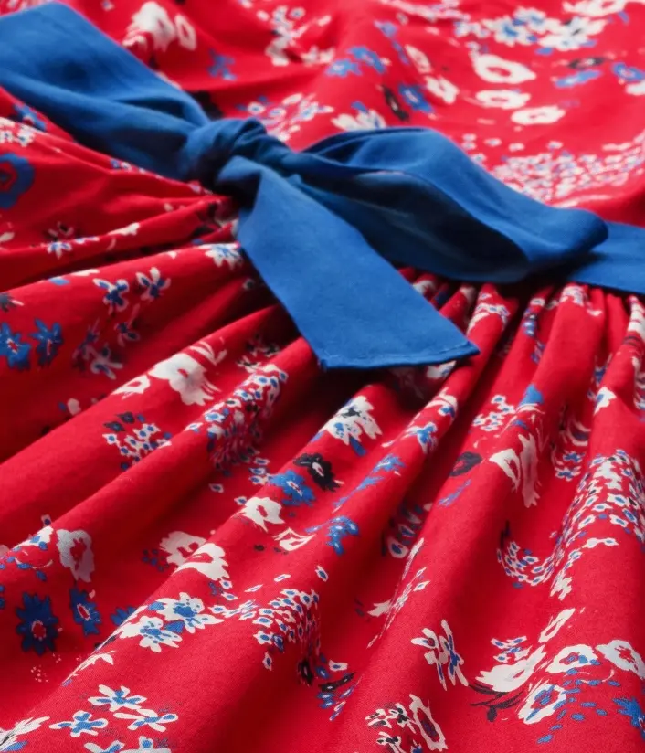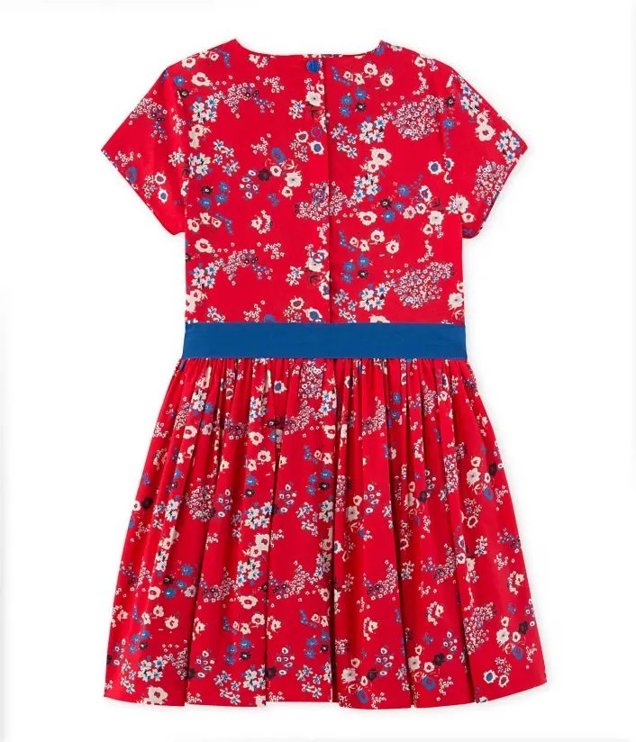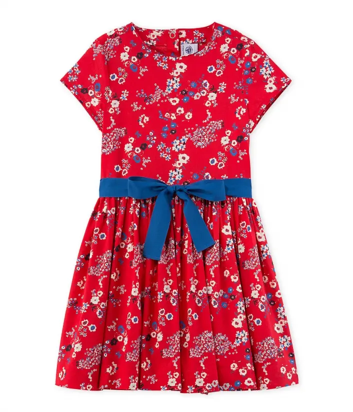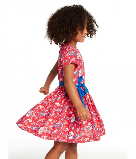 Чарівна літня сукня з короткими рукавами. Виготовлена з бавовняної тканини з квітковим візерунком. Сукня прикрашена синім паском-стрічкою. Зручна застібка на кнопки на спинці. Матеріал: 100% бавовна