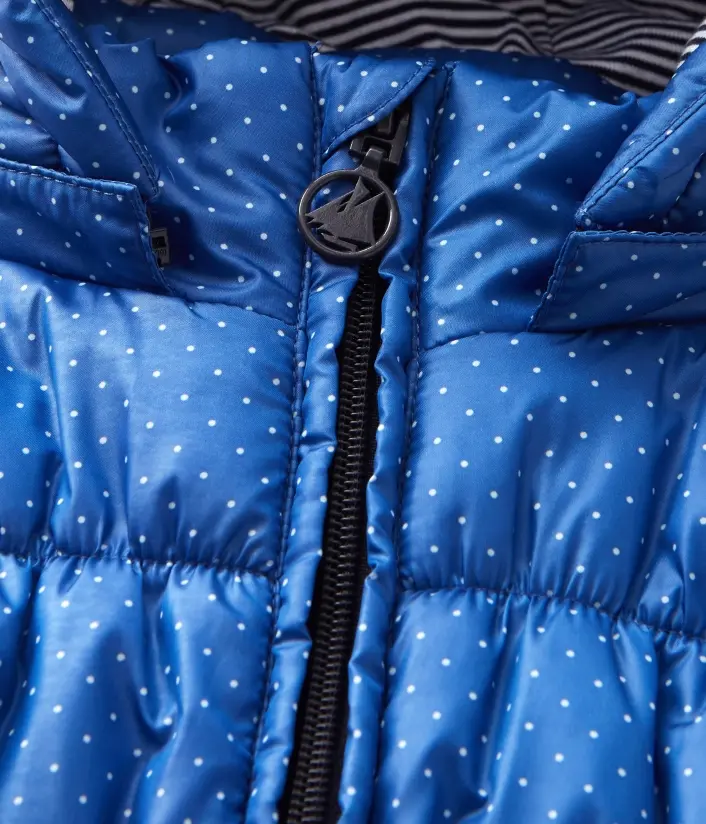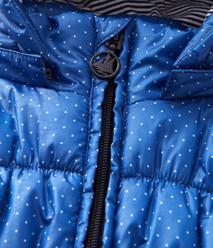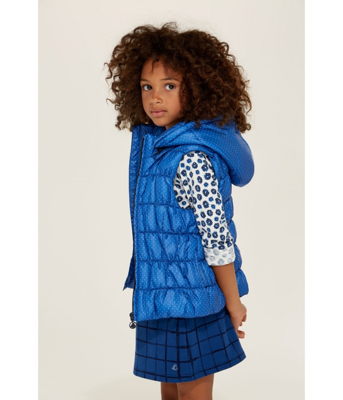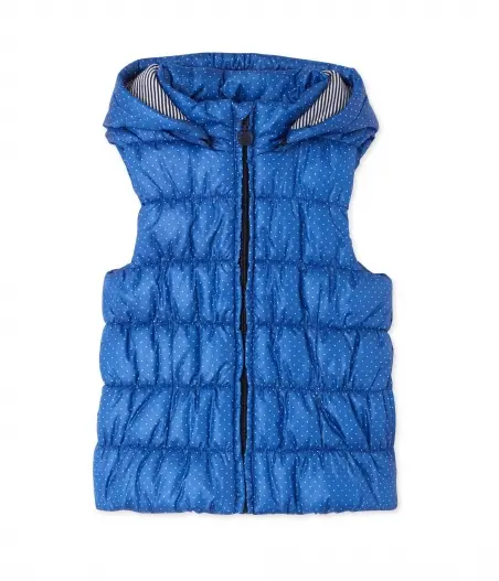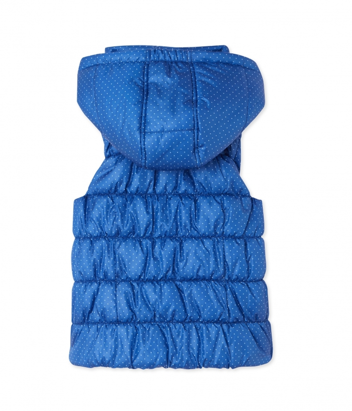 Жилет з капюшоном та кишенями для дівчини, виготовлений з нейлонової тканини у дрібний горошок. Жилет має капюшон, який можна легко відстебнути. Підкладка жилету виготовлена з м'якого, теплого флісу. Матеріал: 100% поліестер; підкладка - 100% бавовна.