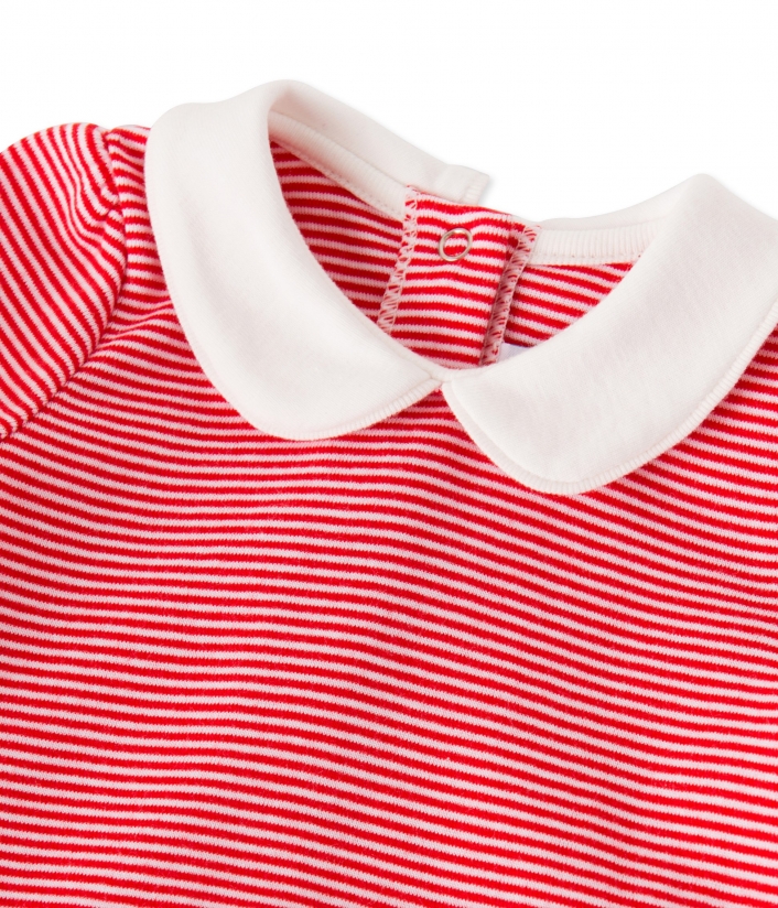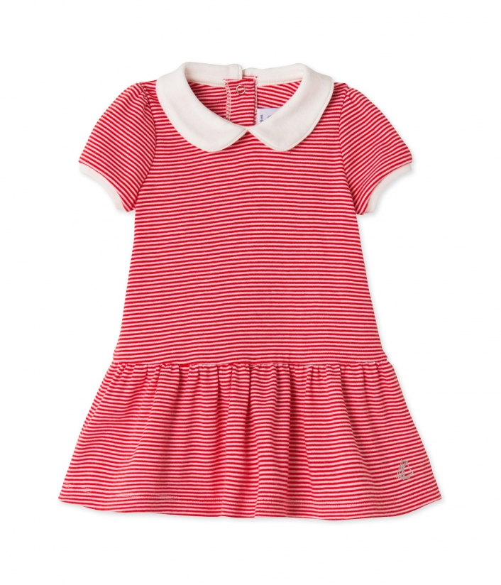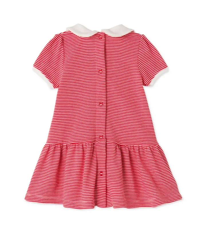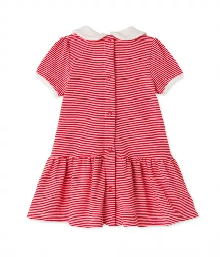 Сукня для дівчинки у дрібну смужку з короткими рукавами, прикрашена комірцем у стилі "Пітер Пен" та оздоблена застібками на кнопки впродовж спинки. Склад: 100% бавовна.