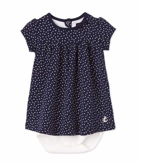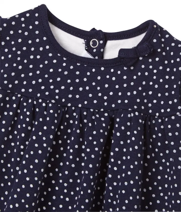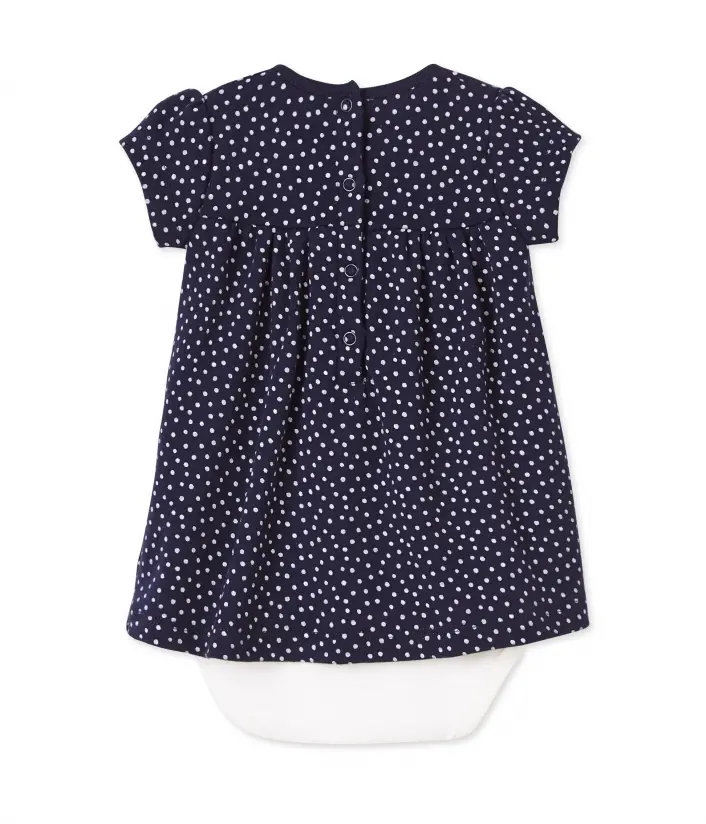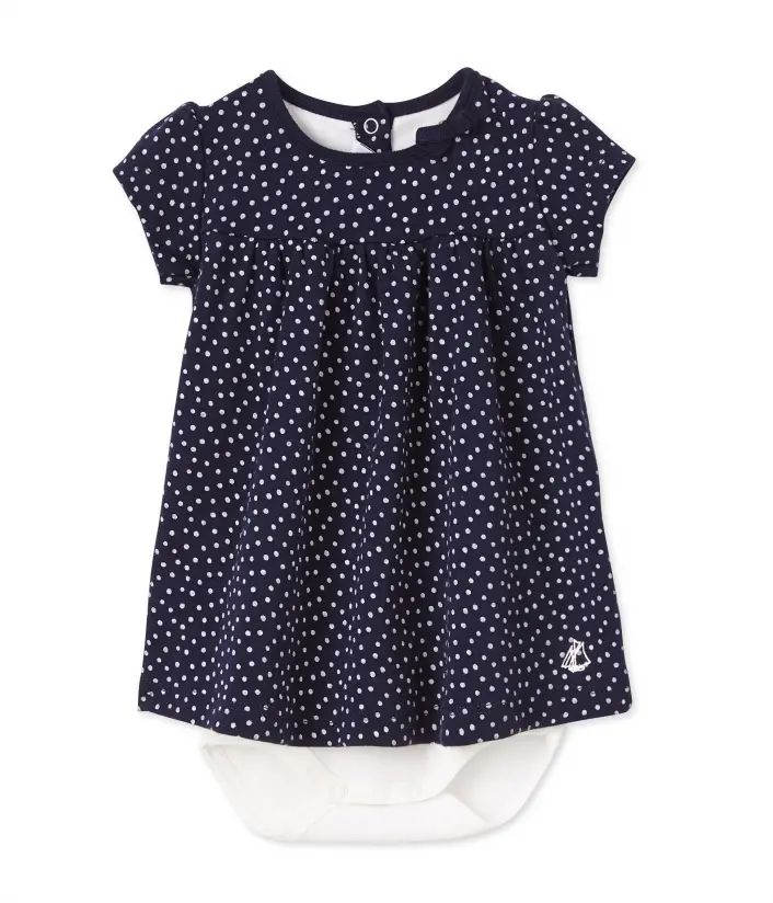 Платье-боди с короткими рукавами для девочки. Верх изготовлен из натурального хлопка в мелкий горошек, низ однотонный - белого цвета. Это чудесное платье-боди Petit Bateau имеет застежки на кнопки между ножек и на спинке. Состав: 100% хлопок.