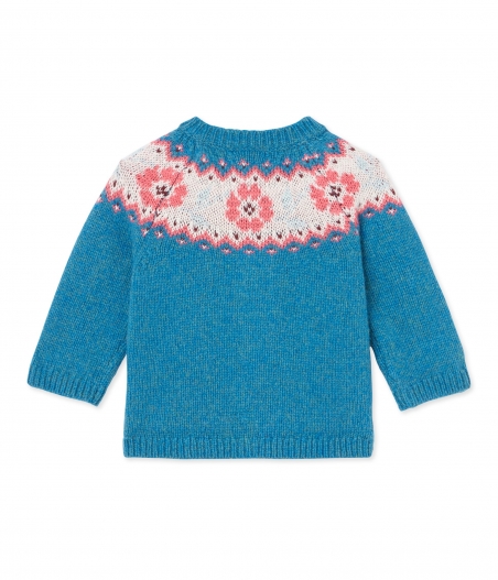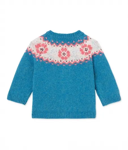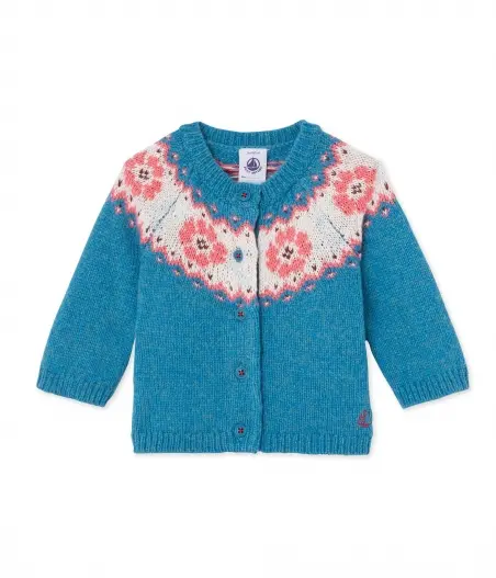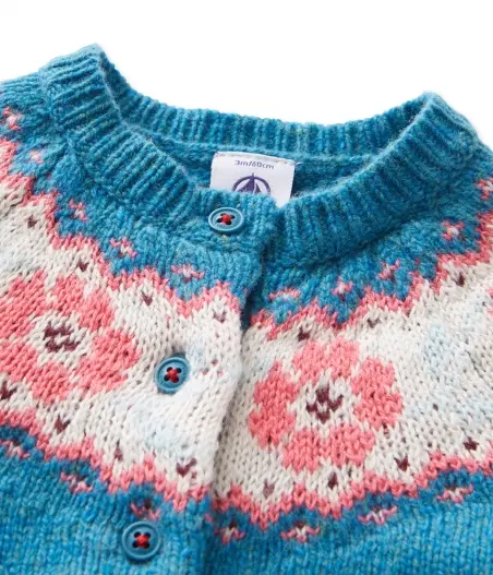 Вязаный кардиган с жаккардовым цветочным узором для девочки. Кардиган прекрасно дополнит зимний гардероб маленькой модницы. Материал: 62% шерсть, 38% полиамид / 57% шерсть, 43% хлопок.