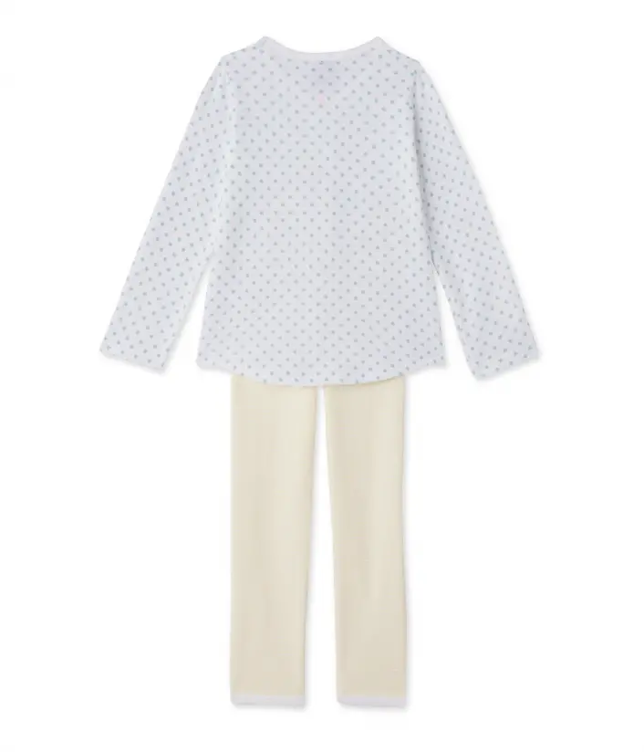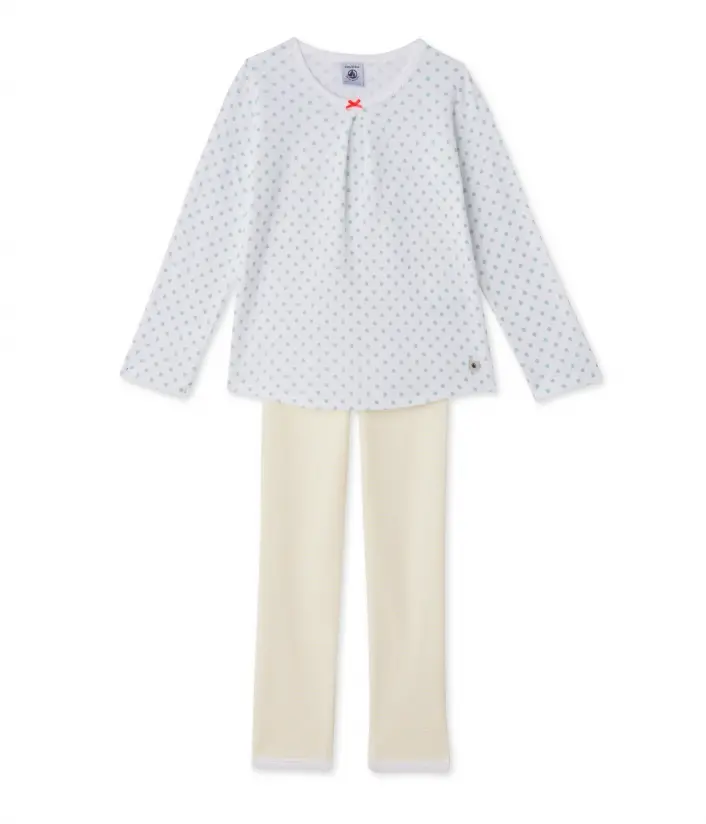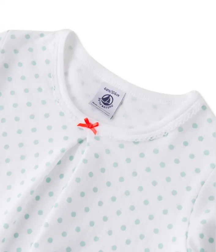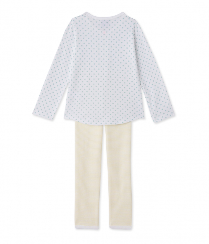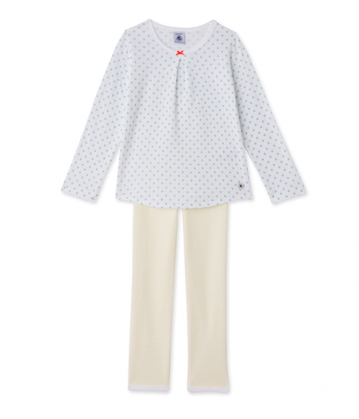 Ця двобарвна піжама для дівчинки створена з комбінації матеріалів. Верх виготовлений з трикотажу в дрібний горошок і прикрашений маленьким бантиком і складкою. Нижня частина піжами виконана в дрібну смужку. Ця на диво м'яка піжама для дівчинки підійде як для літньої ночі, так і для осіннього сезону. Склад: 100% бавовна.