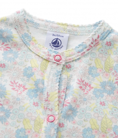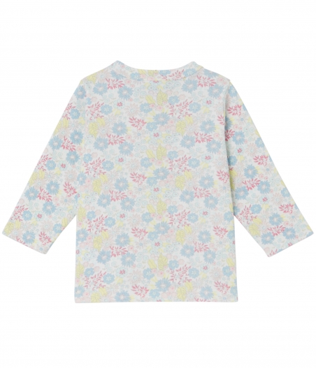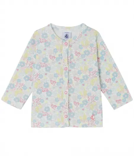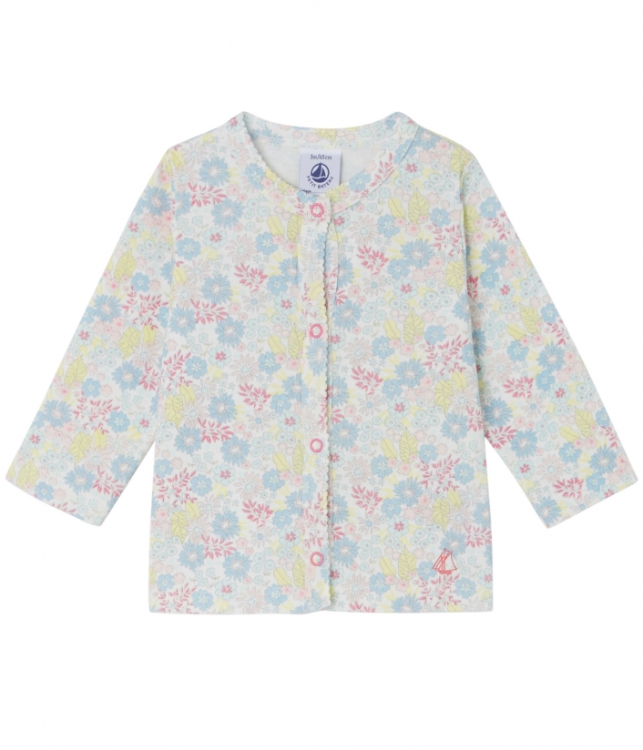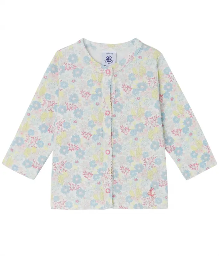 Літній кардиган з круглим вирізом і застібкою на кнопки для дівчинки. Виготовлений з м'якої бавовняної тканини з елегантним багатобарвним квітковим принтом. Витончена обробка в стилі "кокот" на вирізі та планці із застібкою надають особливої ніжності цьому дитячому кардигану. Склад: 100% бавовна.