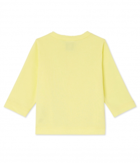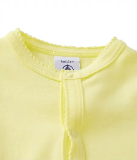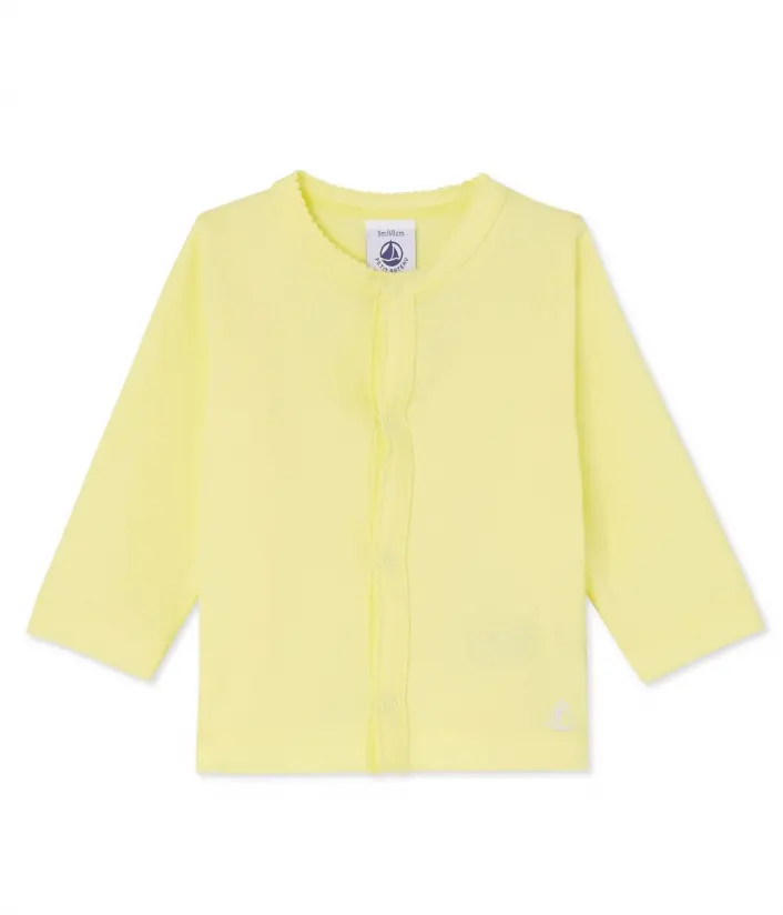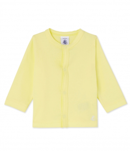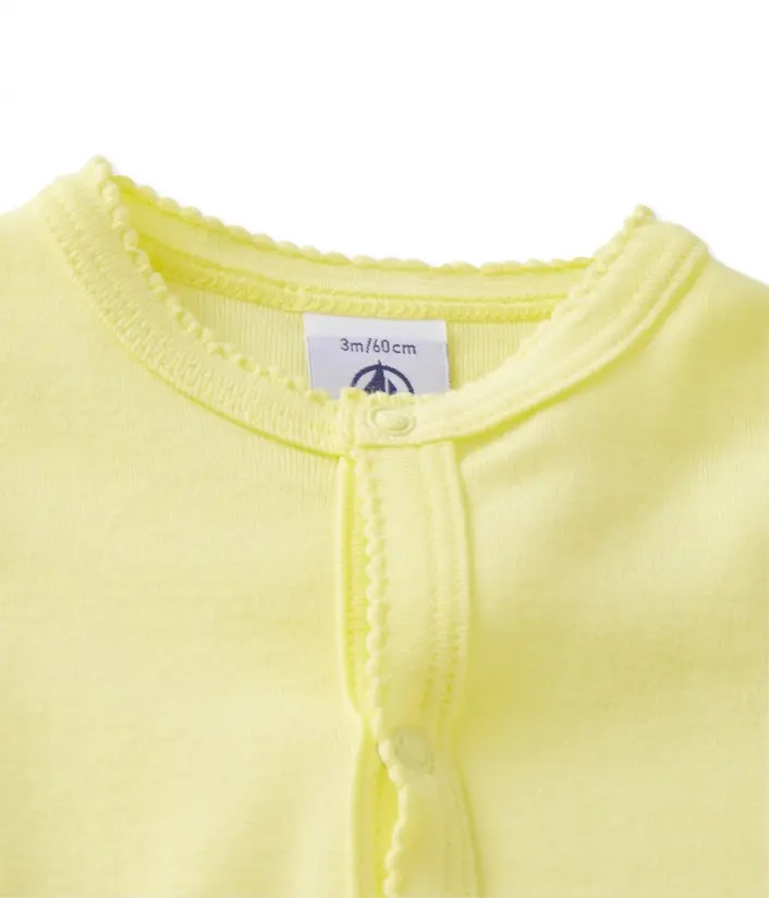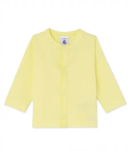 Літній кардиган з круглим вирізом і застібкою на кнопки для дівчинки. Виготовлений з м'якої монотонної бавовняної тканини. Витончена декоративна обробка в стилі "кокот" на вирізі та планці із застібкою надають особливої ніжності цьому дитячому кардигану. Склад: 100% бавовна.