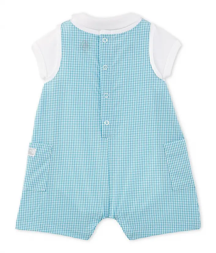 Дитячий комбінезон з короткими рукавами, виготовлений з неймовірно легкого попліну. Комбінезон оздоблений гарними деталями: двомя накладними кишенями по бокам і декоративним оздобленням на вирізі, а також зручними кнопками між ніжками. Цей дитячий набір з боді та комбінезону ідеально підходить для літнього сезона. Склад: 100% бавовна.