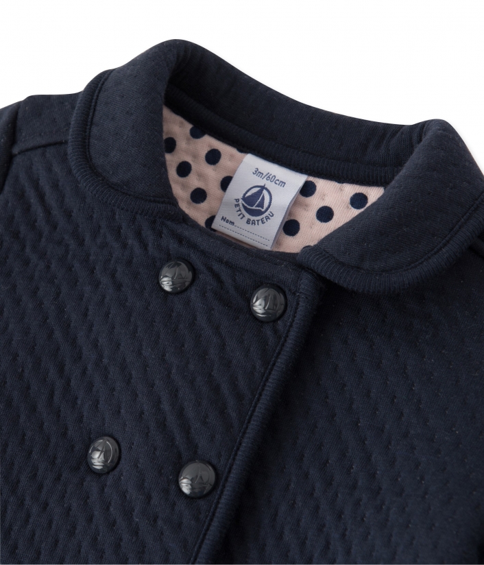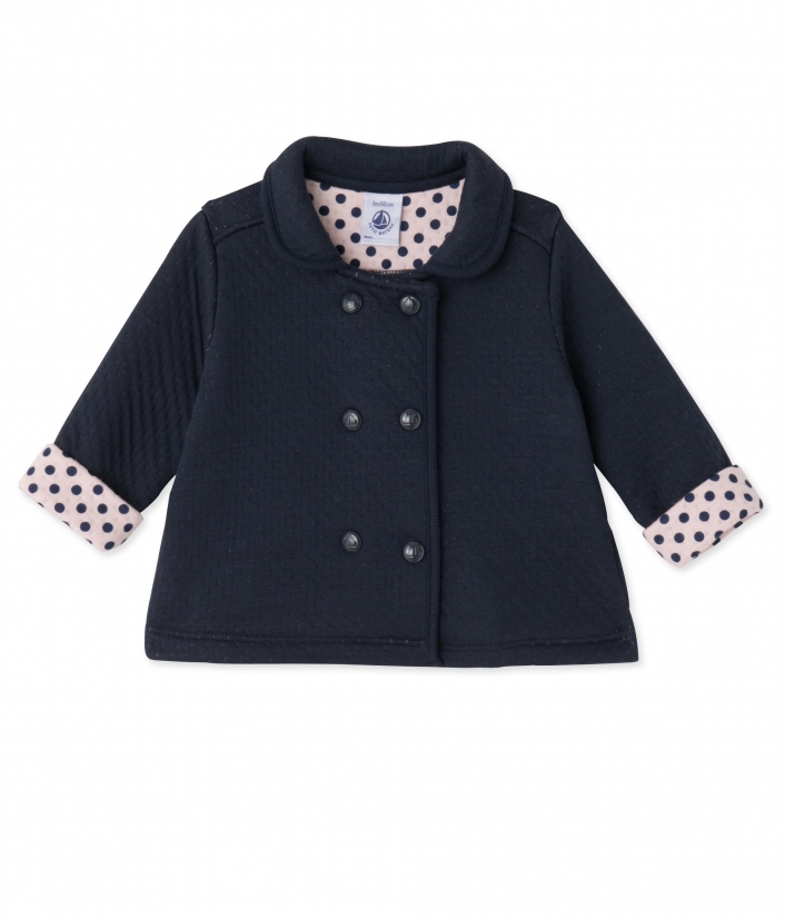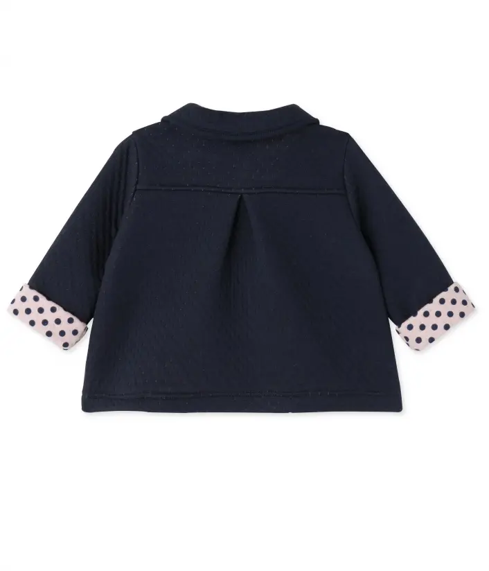 Легкая куртка для девочки, изготовленная из очень мягкой ткани. Подкладка изготовлена из розовой ткани в горошек. Куртка декорирована накладными карманами и маленьким воротничком. Отличная альтернатива кардигану или свитеру в начале сезона. Состав: 75% хлопок, 25% полиэстер.