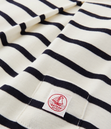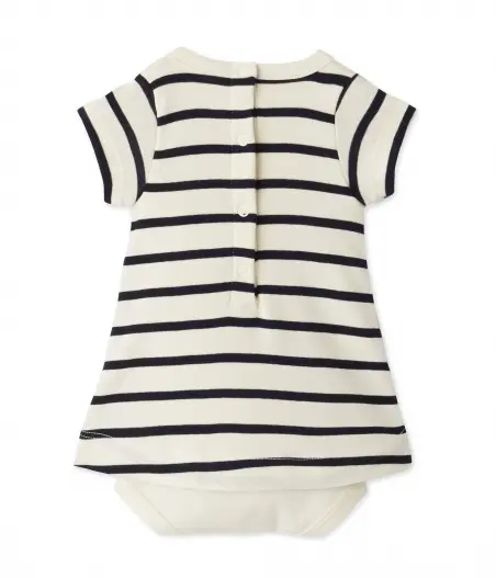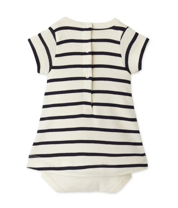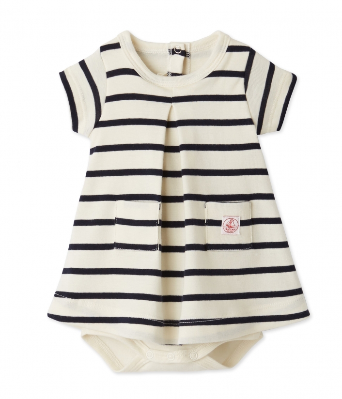 Сукня-боді для дівчинки з застібкою на спинці. Сукня виготовлена з м'якого трикотажу в широку смужку та оздоблена двома накладними кишенями. Склад: 100% бавовна.