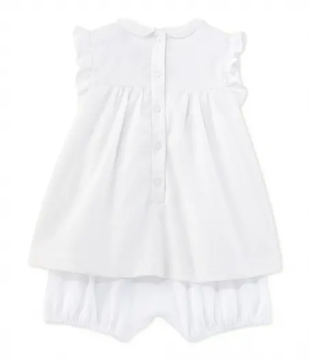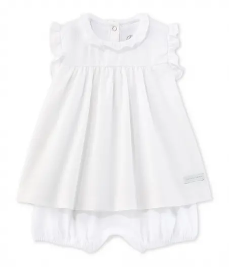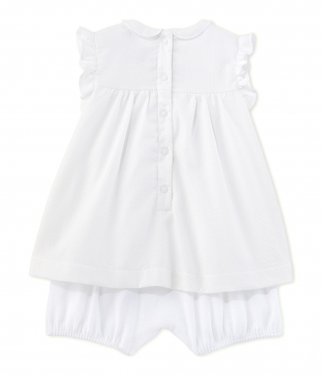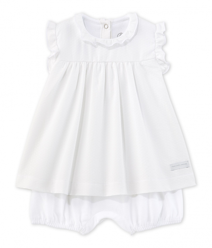 Ми просто не можемо встояти перед цією сукнею для дівчинки з короткими рукавами, виготовленою з простого попліну. Сукня доповнена трусиками-панталонами з бавовняного трикотажу. Ця елегантна сукня оздоблена складками на грудях і чудовими оборками на рукавах і вирізі. Практичні застібки на спинці і між ніжок полегшують одягання дитини. Ідеальний дитячий наряд для особливих днів! Склад: 100% бавовна.