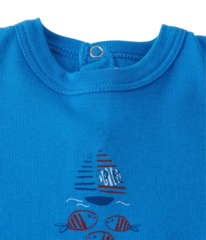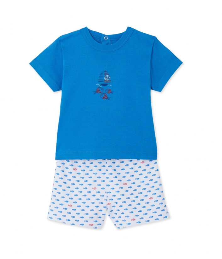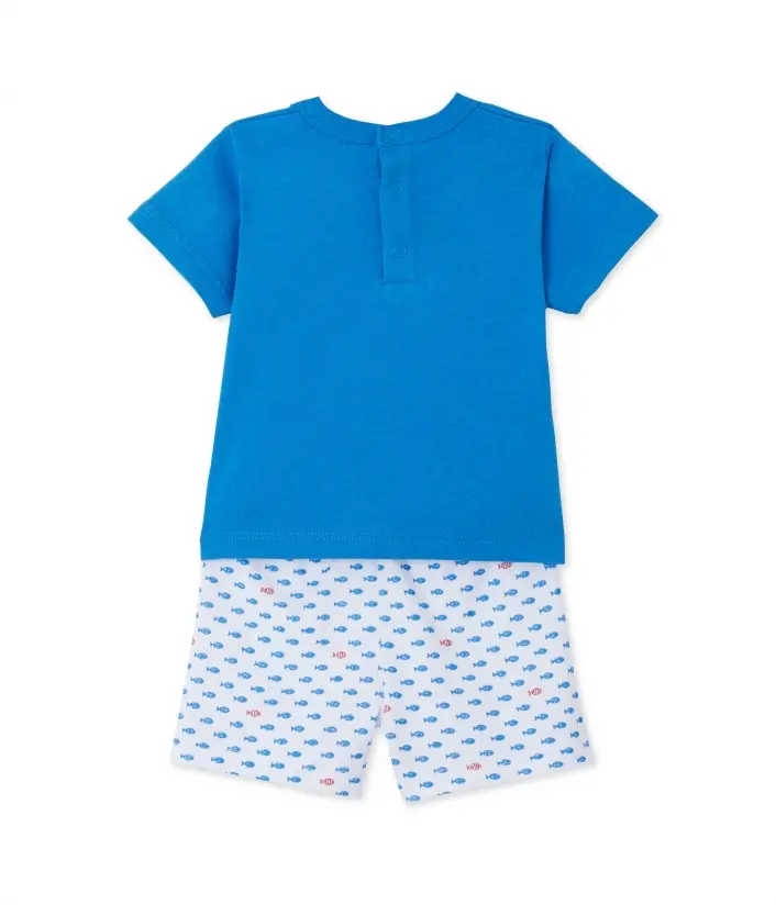 Ця піжама для хлопчика складається з однобарвного верху з короткими рукавами і шортиків з принтом у вигляді рибок. Футболка прикрашена зображенням рибок і оздоблена застібкою на спинці. Шорти мають еластичний пояс, а система застібок з'єднує футболку і шортики, щоб під час сну піжама не задиралася і дитина залишалася в теплі. Ця чарівна піжама для маленьких хлопчиків ідеально підходить для літа і може використовуватись як одяг для пляжу. Склад: 100% бавовна.