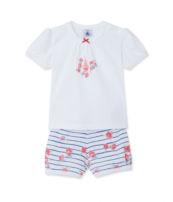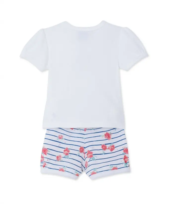 Эта пижама для девочки состоит из однотонного верха с короткими рукавами и шортиков с принтом из полос и цветов. Футболка украшена прекрасным цветочным принтом и маленьким бантиком на вырезе. Шорты имеют эластичный пояс, а система застежек соединяет футболку и шортики, чтобы во время сна пижама не задиралась и ребенок оставался в тепле. Эта чудесная пижама для маленьких девочек идеально подходит для лета. Состав: 100% хлопок.