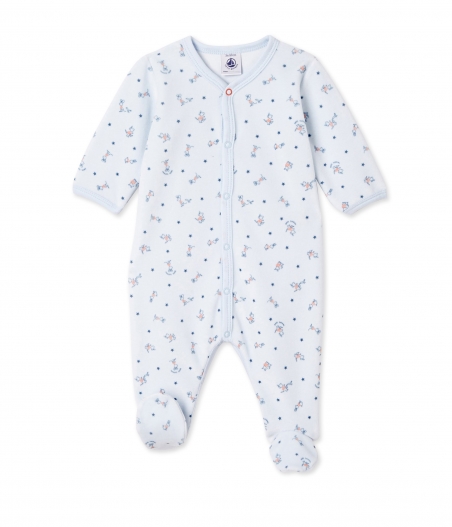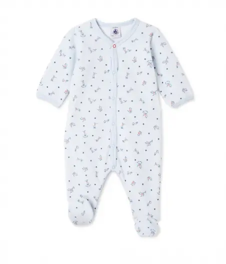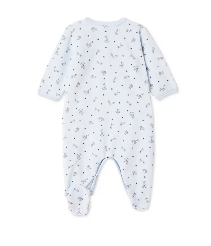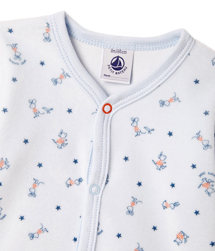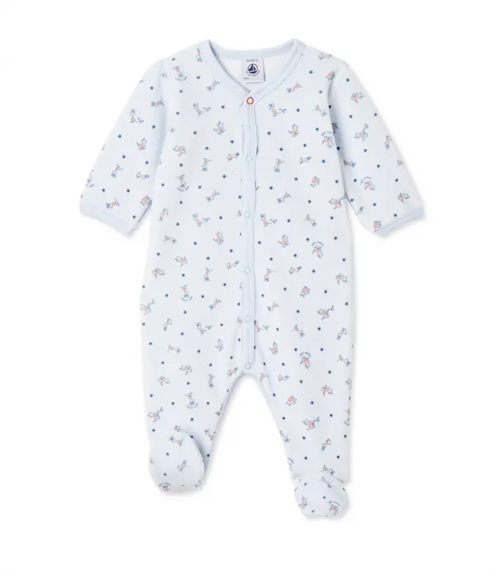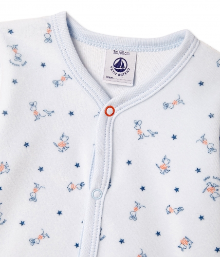 Цей чудовий спальний комбінезон для хлопчика виготовлений з бавовняного велюру з дуже милим принтом у вигляді маленьких кроликів. Піжама має зручну застібку на кнопки вздовж тіла та між ніжками. Цей комфортний комбінезон - важлива частина гардероба немовляти! Склад: 75% бавовна, 25% поліестер.