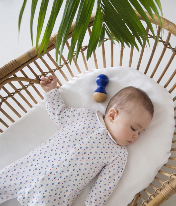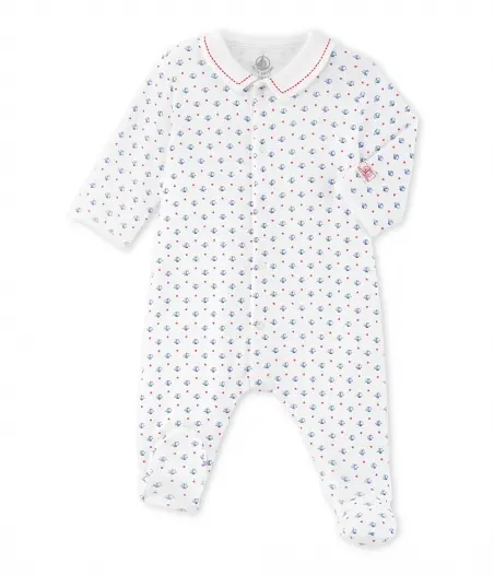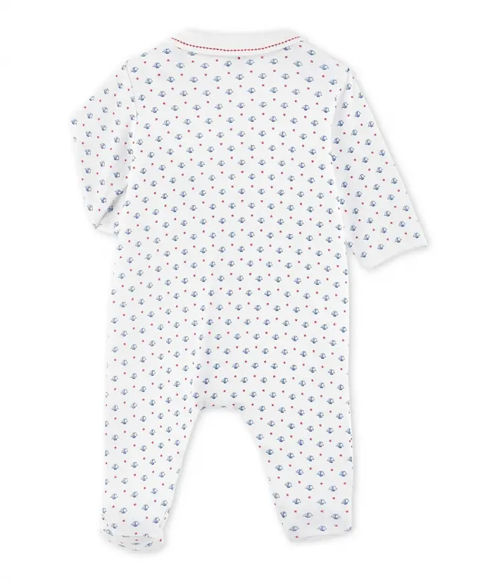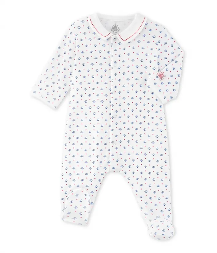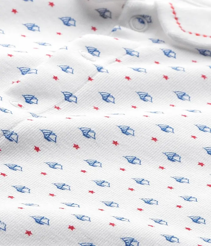 Піжама з принтом у вигляді маленьких човників для хлопчика, виготовлена з натуральної бавовни. Піжама має зручну застібку попереду. Комірець піжами прикрашений елегантною вишивкою. Дуже гарна дитяча піжама, яка ідеально підійде для подарунка новонародженим. Склад: 100% бавовна.