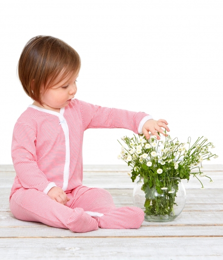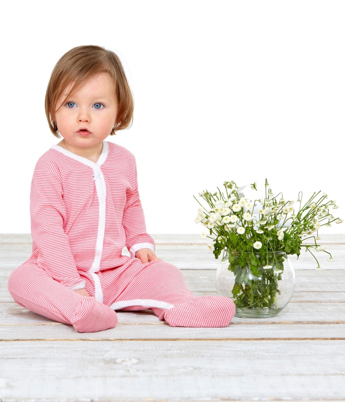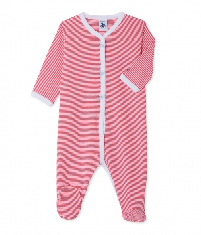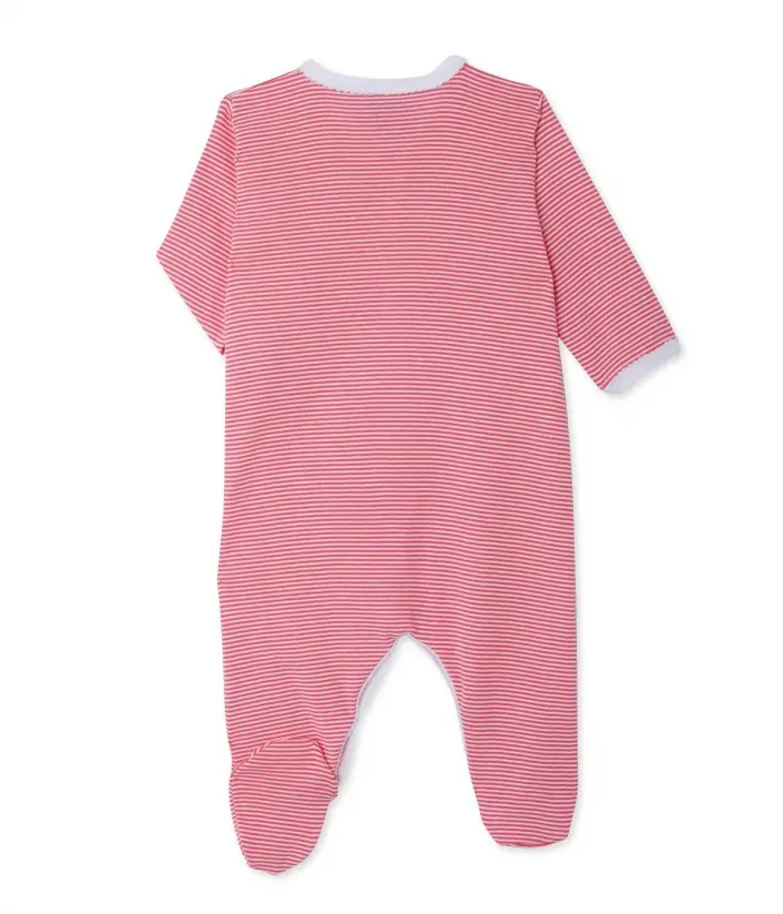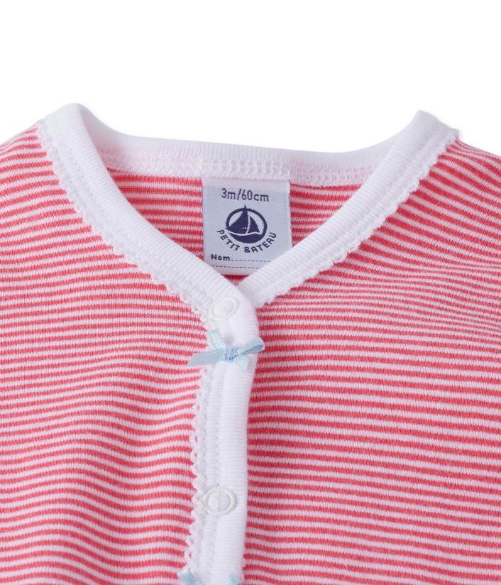 Цей чудовий спальний комбінезон для дівчинки виготовлений з натуральної бавовняної тканини у дрібну смужку. Піжама має зручну застібку на кнопки вздовж тіла та між ніжками. Цей комфортний комбінезон - важлива частина гардероба немовляти! Склад: 100% бавовна.