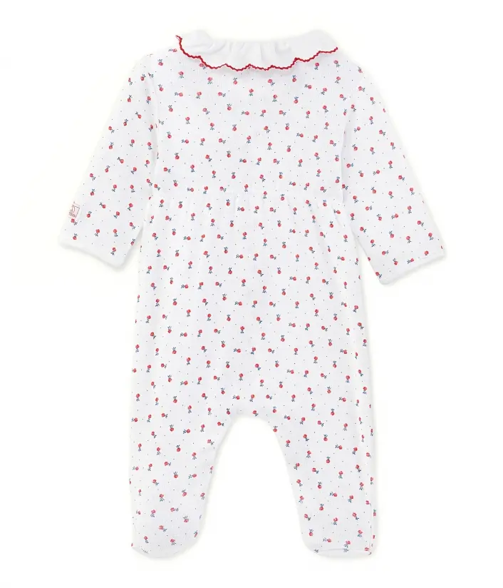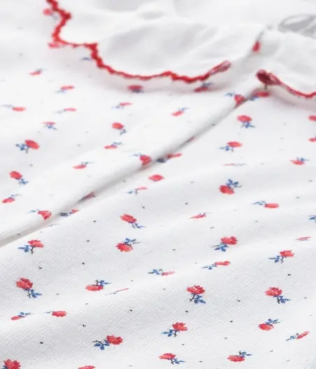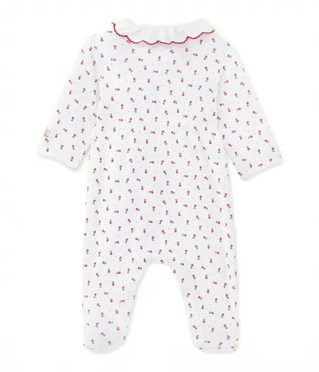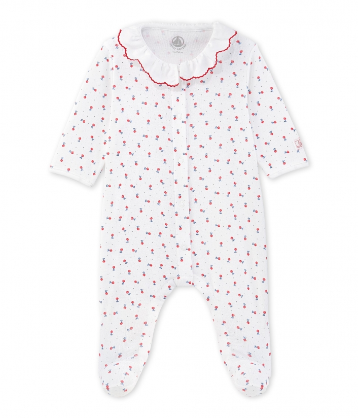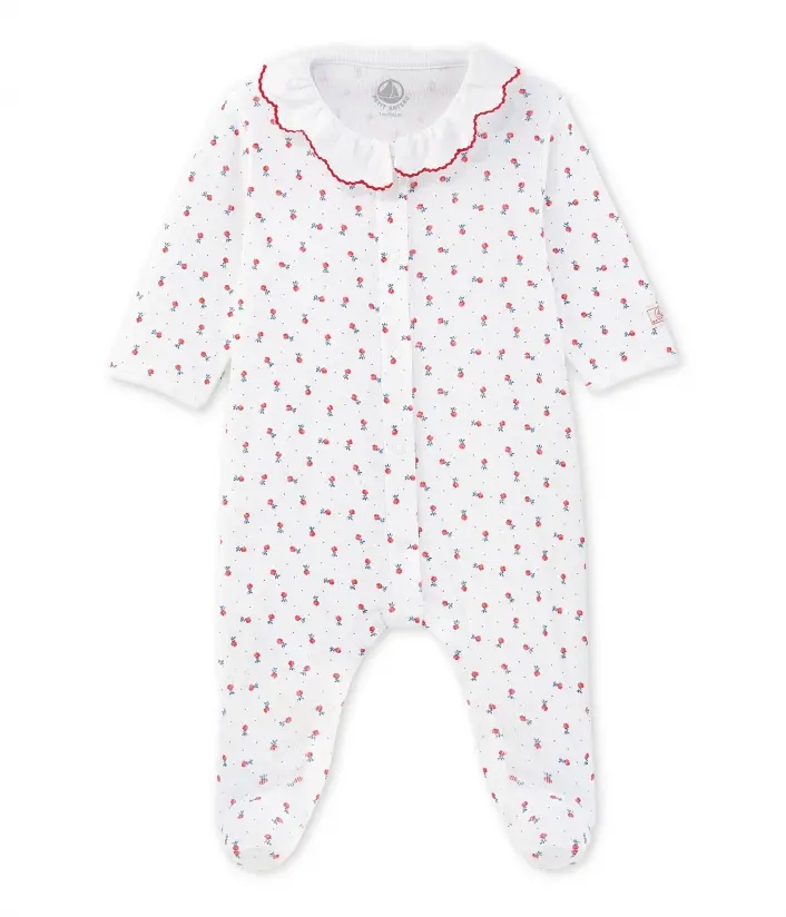 Піжама з довгими рукавами и закритими ніжками. Піжама прикрашена квітковим візерунком і декорована гарним комірцем, має зручні застібки впродовж тіла та між ніжками. Склад: 100% бавовна.