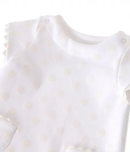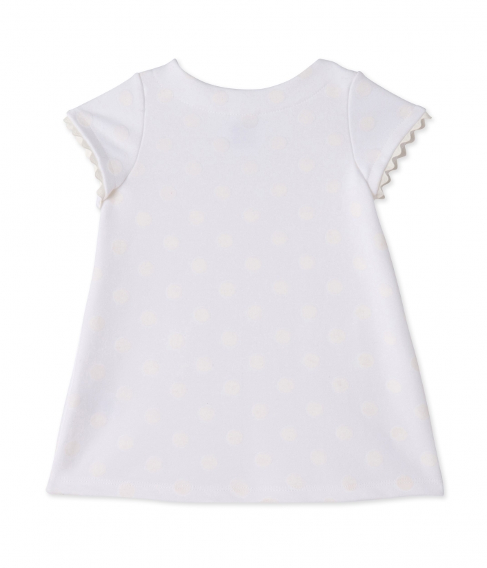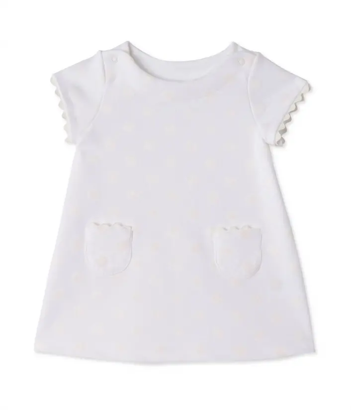 Чудова сукня з короткими рукавами для дівчинки, прикрашена елегантним набивним візерунком тон-в-тон у вигляді великих горошин. "A"-подібний силует сукні ідеально пасує немовлятам. Зверніть увагу на стильну зубчату обробку кишень і рукавів. Елегантна та дуже зручна літня сукня для дівчинки для особливих випадків. Склад: 100% бавовна.