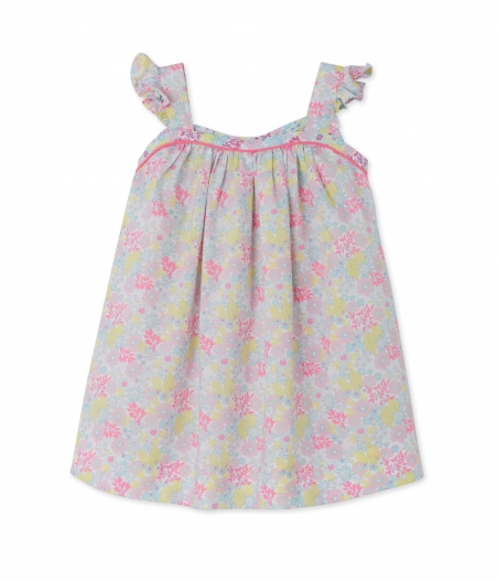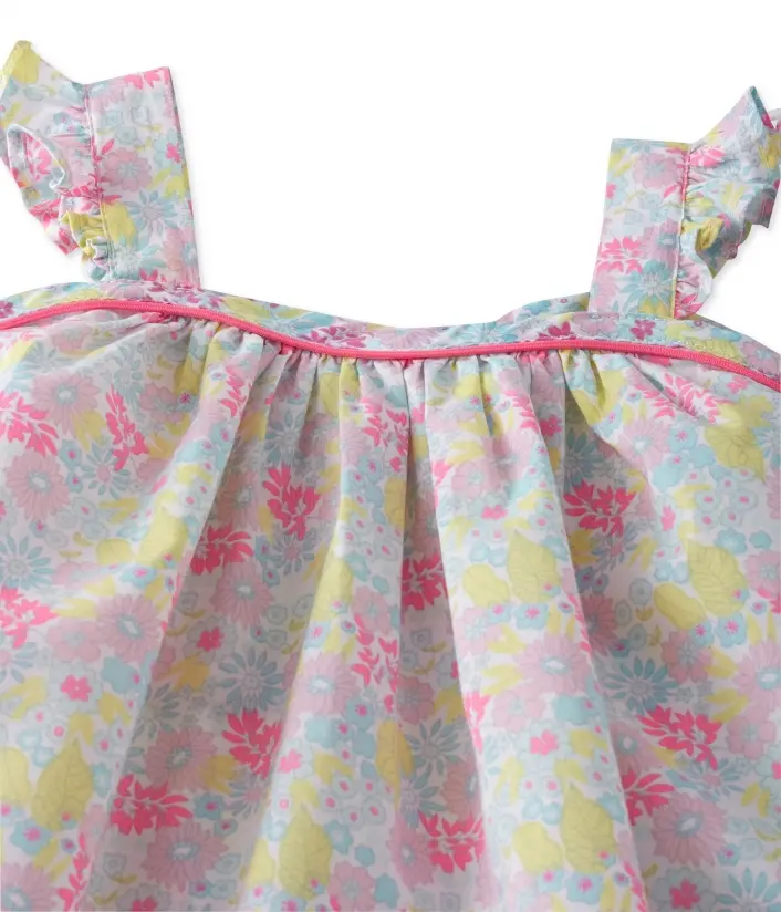 Неймовірно гарний літній сарафан для дівчинки-малюка з квітковим візерунком. Бретелі оздоблені оборками-крильцями. Впродовж спинки сарафан має застібки на кнопки. Склад: 100% бавовна.